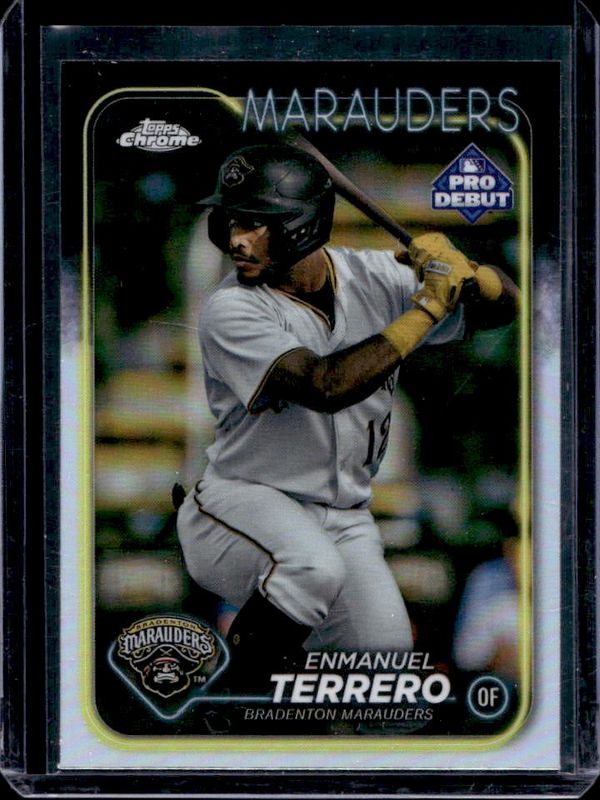 The Enmanuel Terrero 2024 Topps Pro Debut #PDC-12 Chrome card is 1 of 31 Enmanuel Terrero's card variations in the 2024 Topps Pro Debut set being tracked by Sports Card Investor, including Base, Fuchsia Foil /199, Sparkle Foil /175, Blue Foil /150, and Green Foil /99.