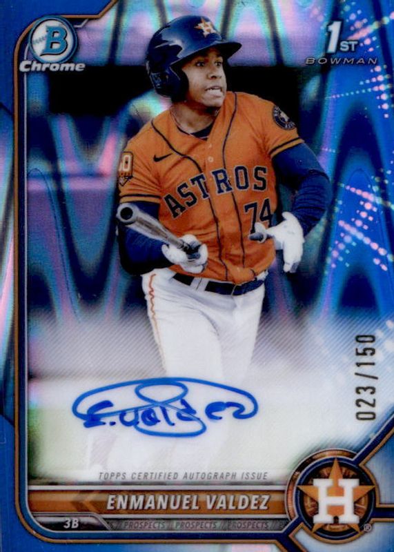 The Enmanuel Valdez 2022 Bowman Chrome #CPA-EV Prospect Auto - Blue RayWave Refractor /150 (1st) card in Raw condition has not changed in price in the last 30 days and was last sold for $1.76 .