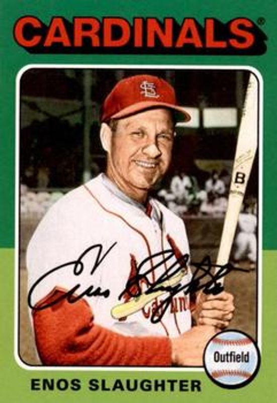 The Enos Slaughter 2019 Topps Archives #75M-65 1975 Topps Mini card is 1 of 7 Enos Slaughter's card variations in the 2019 Topps Archives set being tracked by Sports Card Investor, including Base, Purple /175, Silver /99, Blue /25, and Gold /1.