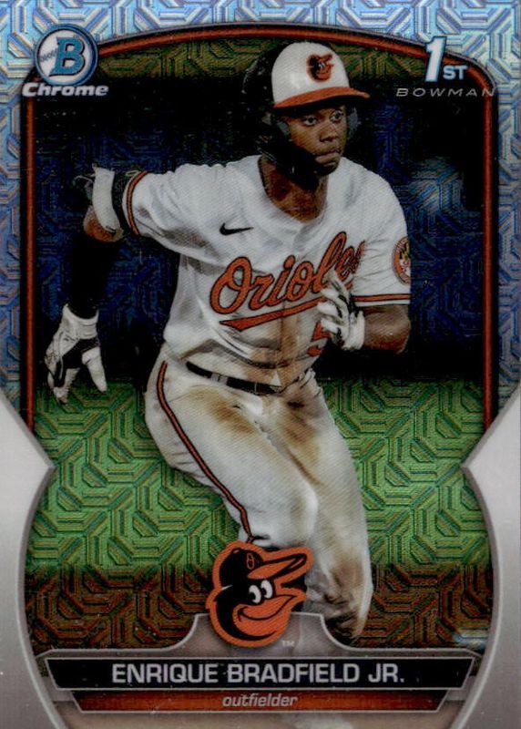This card is 1 of 45 Enrique Bradfield Jr.'s card variations in the 2023 Bowman Draft set being tracked by Sports Card Investor, including Chrome (1st), Chrome Image Variation (Bunting), Chrome - Lunar Glow Refractor (1st), Chrome - Pearl Refractor (1st), and Chrome - Refractor (1st).