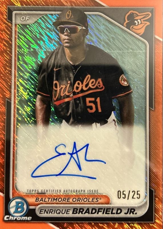 Best Prices Available For Sale of Enrique Bradfield Jr. 2024 Bowman #CPA-EBR Chrome Prospect Auto - Orange Refractor /25