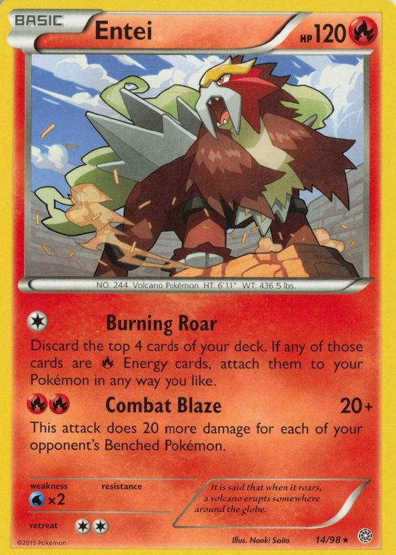The Entei 2015 XY: Ancient Origins #14/98 Base card in Raw TCG (Lightly Played) condition has moved down -$0.39 (-16.4%) in the last 30 days and was last sold for $1.99 .