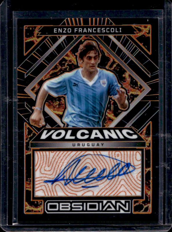 The Enzo Francescoli 2022 Obsidian #VS-EF Volcanic Signatures - Electric Etch Orange /75 card is 1 of 27 Enzo Francescoli's card variations in the 2022 Obsidian set being tracked by Sports Card Investor, including Aurora Autographs /199, Volcanic Signatures /199, Lightning Strike Autographs /101, Aurora Autographs - Electric Etch Orange /75, and Lightning Strike Autographs - Electric Etch Orange /75.