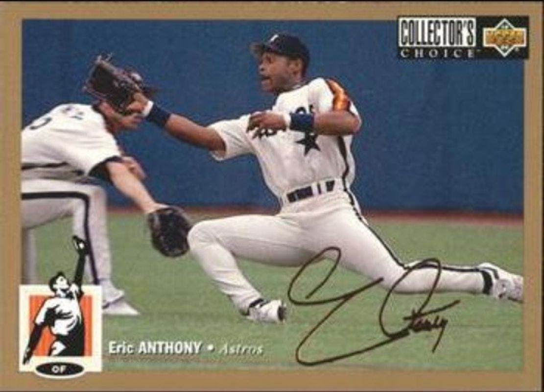 The Eric Anthony 1994 Upper Deck Collector's Choice #38 Gold Signatures card is 1 of 6 Eric Anthony's card variations in the 1994 Upper Deck Collector's Choice set being tracked by Sports Card Investor, including #38 Base, #411 Base, #411 Gold Signatures, #38 Silver Signatures, and #411 Silver Signatures.