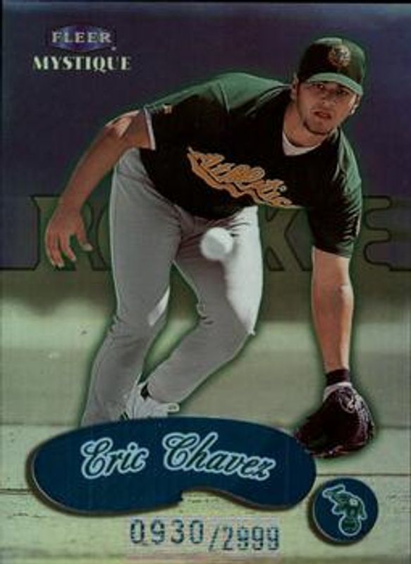 The Eric Chavez 1999 Fleer Mystique #131 Base /2999 Rookie card is 1 of 4 Eric Chavez's card variations in the 1999 Fleer Mystique set being tracked by Sports Card Investor, including #131 Masterpiece /1, #1 Prophetic /1999, and #1-P Prophetic /1999.