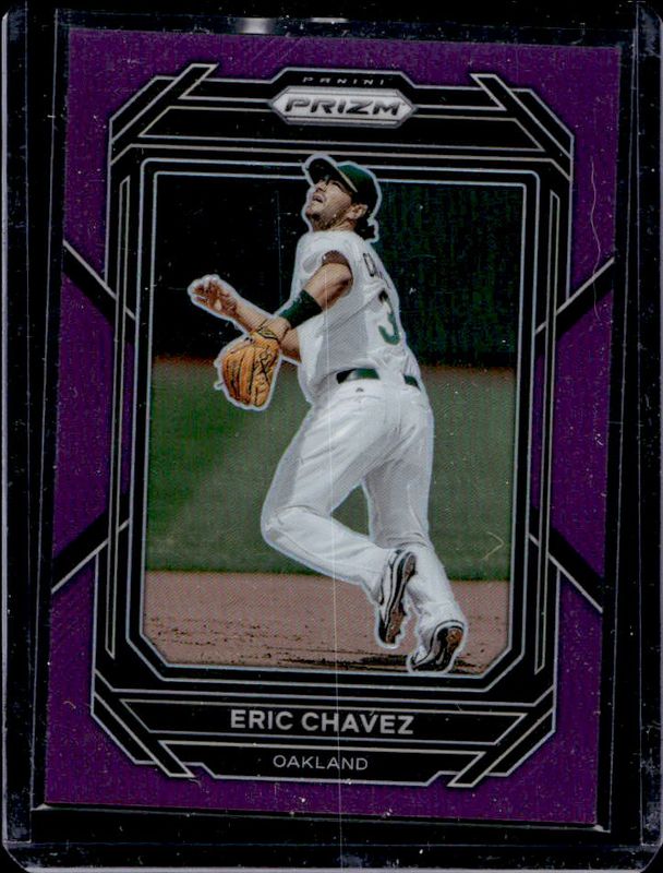 The Eric Chavez 2023 Prizm #252 Purple /99 card is 1 of 39 Eric Chavez's card variations in the 2023 Prizm set being tracked by Sports Card Investor, including Base, Blue Ice, Giraffe, Green Ice, and Hyper.