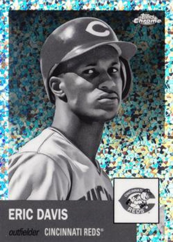 The Eric Davis 2022 Topps Chrome Platinum Anniversary #248 Black & White Mini Diamond Refractor card is 1 of 34 Eric Davis' card variations in the 2022 Topps Chrome Platinum Anniversary set being tracked by Sports Card Investor, including Base, Blue Prism Refractor, Gold Prism Refractor, Prism Refractor, and Red Prism Refractor.