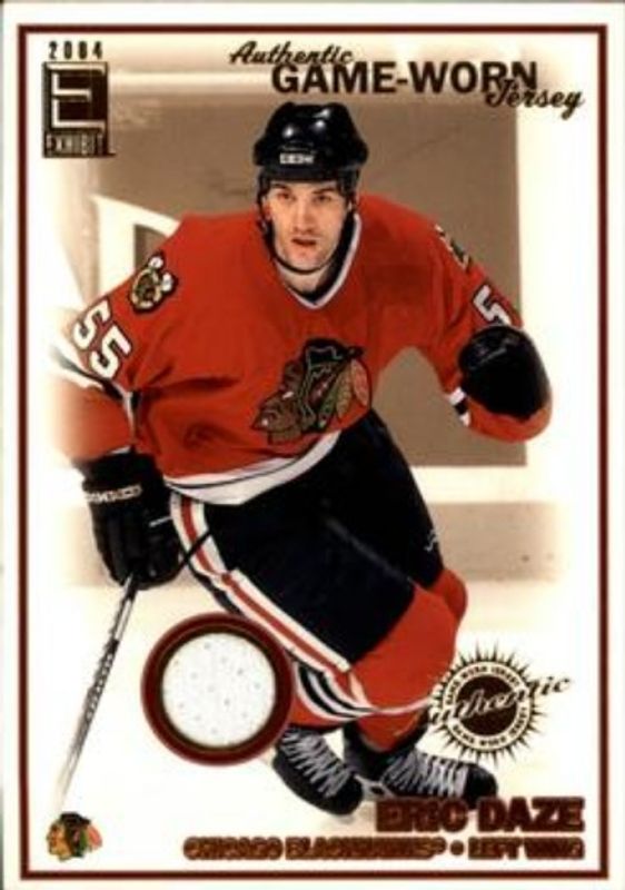 The Eric Daze 2003 Pacific Exhibit #203 Base /955 card is 1 of 5 Eric Daze's card variations in the 2003 Pacific Exhibit set being tracked by Sports Card Investor, including Base /955, Yellow Backs, Silver /465, and Blue Backs /275.