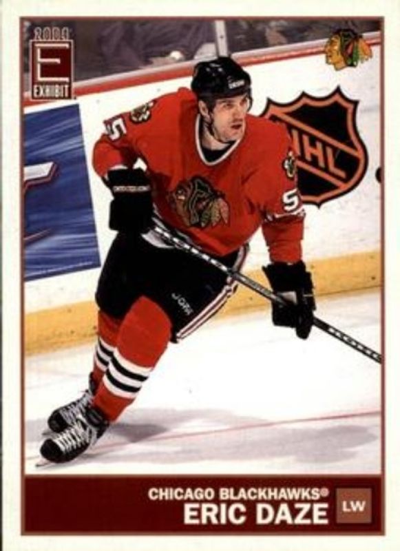 The Eric Daze 2003 Pacific Exhibit #32 Blue Backs /275 card is 1 of 5 Eric Daze's card variations in the 2003 Pacific Exhibit set being tracked by Sports Card Investor, including #203 Base /955, #32 Base /955, #32 Yellow Backs, and #203 Silver /465.