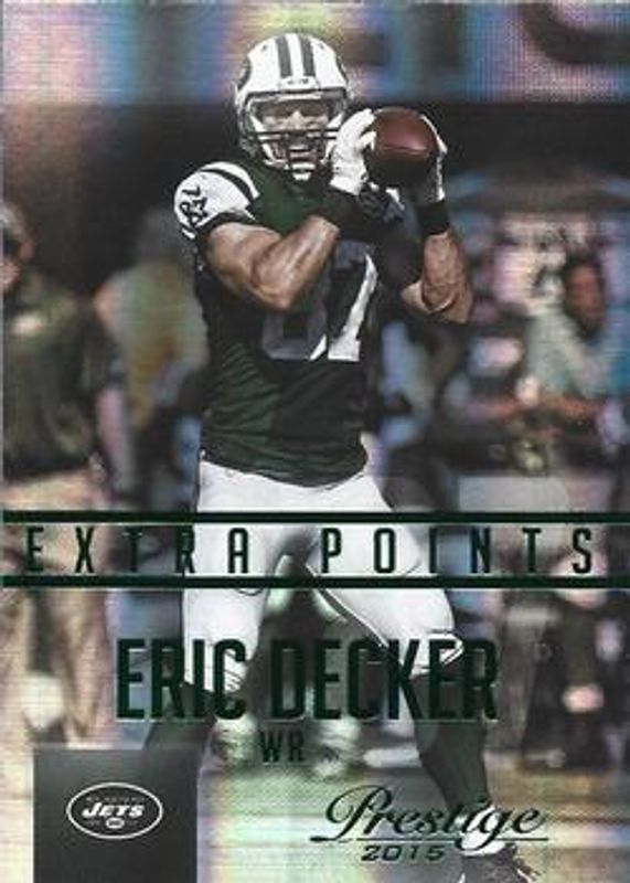 The Eric Decker 2015 Prestige #28 Extra Points Green card is 1 of 15 Eric Decker's card variations in the 2015 Prestige set being tracked by Sports Card Investor, including Base, Extra Points Blue, Extra Points Red, Extra Points Purple /100, and Extra Points Gold /50.