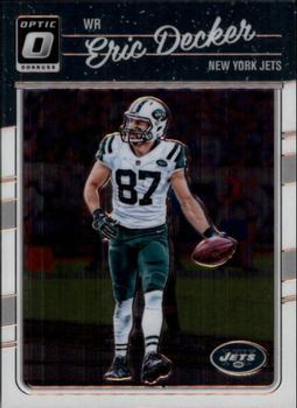 The Eric Decker 2016 Optic #73 Base card is 1 of 17 Eric Decker's card variations in the 2016 Optic set being tracked by Sports Card Investor, including Holo, Peyton Manning Top Targets, Aqua /299, Orange /199, and Blue /149.