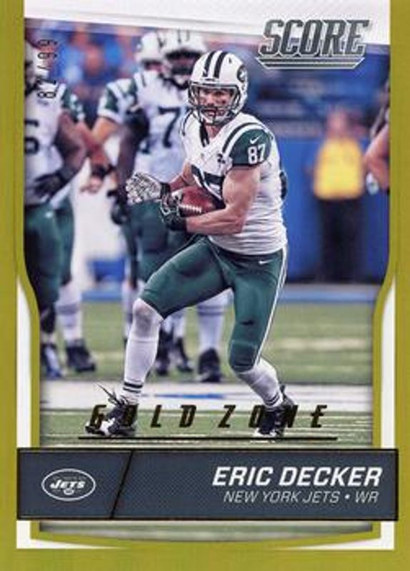 The Eric Decker 2016 Score #224 Gold Zone /50 card is 1 of 27 Eric Decker's card variations in the 2016 Score set being tracked by Sports Card Investor, including Base, Scorecard, Jumbo Gold Zone /99, Showcase /99, and Jumbo Artist's Proof /50.