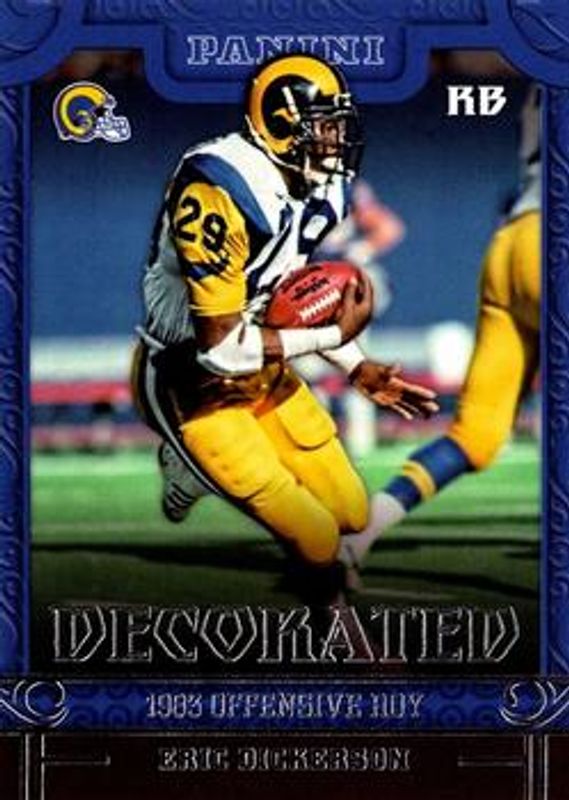 The Eric Dickerson 2016 Panini #20 Decorated card is 1 of 12 Eric Dickerson's card variations in the 2016 Panini set being tracked by Sports Card Investor, including Accolades, Legends of the Shield, Accolades - Red /25, Decorated - Red /25, and Legends of the Shield - Red /25.