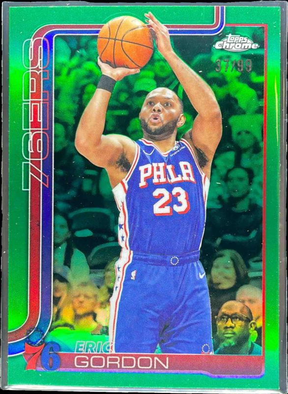 The Eric Gordon 2025 Topps Chrome #184 Green Refractor /99 card is 1 of 64 Eric Gordon's card variations in the 2025 Topps Chrome set being tracked by Sports Card Investor, including Base, Basketball Refractor, Box Set Refractor, Lightboard Logo Refractor, and Negative Refractor.