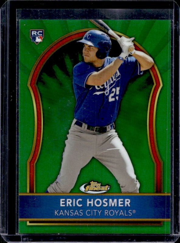 The Eric Hosmer 2011 Topps Finest #63 Green Refractor /199 Rookie card is 1 of 30 Eric Hosmer's card variations in the 2011 Topps Finest set being tracked by Sports Card Investor, including Base, Refractor /549, X-Fractor /299, Orange Refractor /99, and Gold Refractor /50.