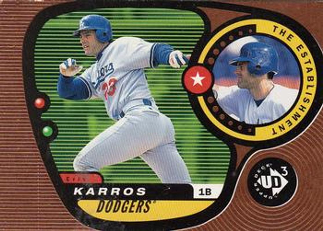 The Eric Karros 1998 Upper Deck UD3 #161 Base card is 1 of 6 Eric Karros' card variations in the 1998 Upper Deck UD3 set being tracked by Sports Card Investor, including #251 Base, #71 Base, #161 Die-Cut /100, #251 Die-Cut /100, and #71 Die-Cut /100.