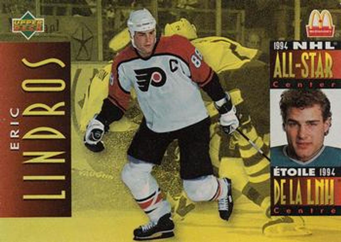 The Eric Lindros 1994 Upper Deck McDonald's #McD-09 Base card is 1 of 2 Eric Lindros' card variations in the 1994 Upper Deck McDonald's set being tracked by Sports Card Investor, including Base.