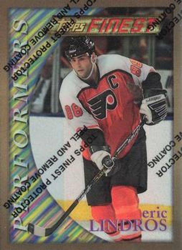 The Eric Lindros 1995 Topps Finest #88 Refractor card is 1 of 4 Eric Lindros' card variations in the 1995 Topps Finest set being tracked by Sports Card Investor, including #1 Base, #88 Base, and #1 Refractor.