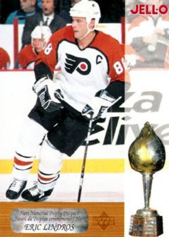 The Eric Lindros 1996 Upper Deck Kraft Jell O Award Winners card is 1 of 3 Eric Lindros' card variations in the 1996 Upper Deck Kraft set being tracked by Sports Card Investor, including Kraft Dinner Magnets, and Kraft Dinner MVP.