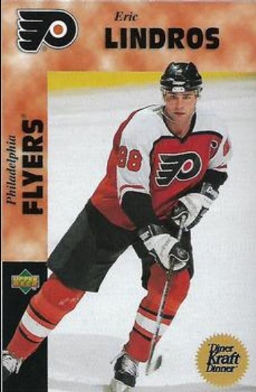 The Eric Lindros 1996 Upper Deck Kraft Kraft Dinner MVP card is 1 of 3 Eric Lindros' card variations in the 1996 Upper Deck Kraft set being tracked by Sports Card Investor, including Jell O Award Winners, and Kraft Dinner Magnets.