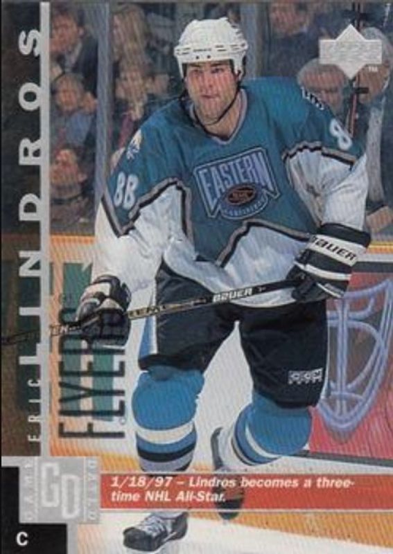 The Eric Lindros 1997 Upper Deck #331 Base card is 1 of 10 Eric Lindros' card variations in the 1997 Upper Deck set being tracked by Sports Card Investor, including Game Dated, Box Toppers, Series Two Jumbo, Smooth Grooves, and The Specialists.