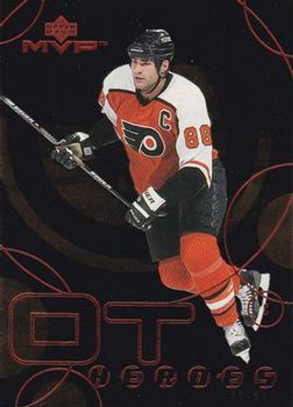 The Eric Lindros 1998 Upper Deck MVP #OT10 OT Heroes card is 1 of 9 Eric Lindros' card variations in the 1998 Upper Deck MVP set being tracked by Sports Card Investor, including Base, Silver Script, Gold Script /100, Super Script /25, and Power Game.