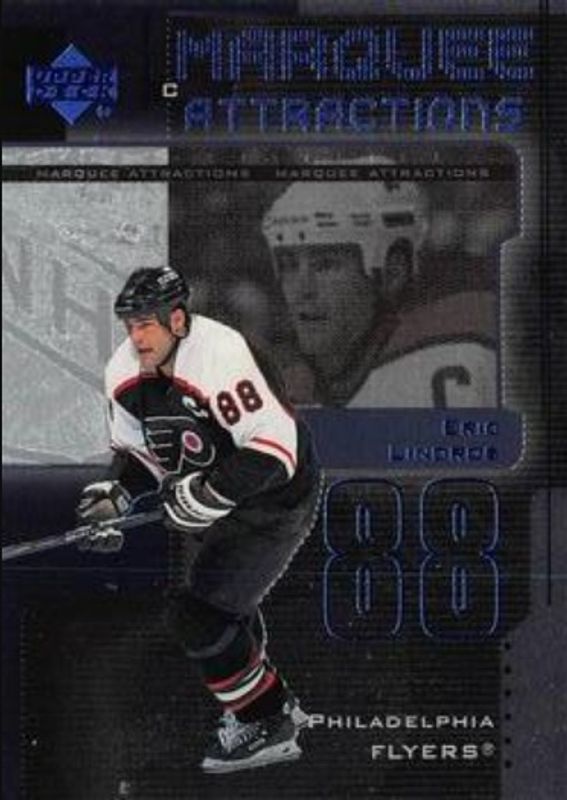 The Eric Lindros 1999 Upper Deck #MA3 Marquee Attractions card is 1 of 39 Eric Lindros' card variations in the 1999 Upper Deck set being tracked by Sports Card Investor, including #137 Base, #94 Base, #137 UD Exclusives /100, #94 UD Exclusives /100, and #137 UD Exclusives 1/1 /1.