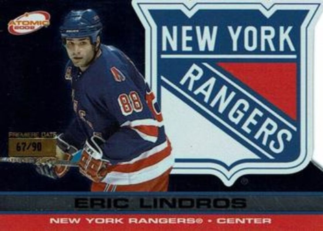 The Eric Lindros 2001 Pacific Atomic #65 Premiere Date /90 card is 1 of 7 Eric Lindros' card variations in the 2001 Pacific Atomic set being tracked by Sports Card Investor, including Base /500, Red /290, Gold /200, Blue /9, and Power Play.