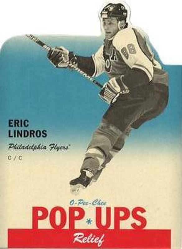 The Eric Lindros 2012 O-Pee-Chee #PU-38 Pop Ups card is 1 of 11 Eric Lindros' card variations in the 2012 O-Pee-Chee set being tracked by Sports Card Investor, including Base, Rainbow, Retro, Retro Blank Back, and Black Rainbow /100.