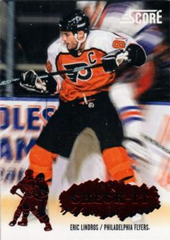 The Eric Lindros 2013 Score #CI-24 Check It card is 1 of 3 Eric Lindros' card variations in the 2013 Score set being tracked by Sports Card Investor, including Season Highlights, and Recollection Collection Autographs.