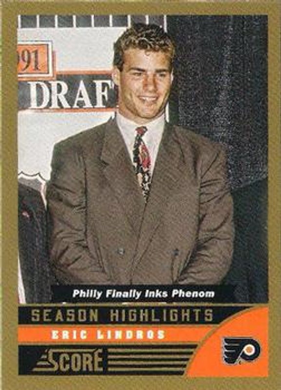 The Eric Lindros 2013 Score #6 Season Highlights card is 1 of 3 Eric Lindros' card variations in the 2013 Score set being tracked by Sports Card Investor, including Check It, and Recollection Collection Autographs.