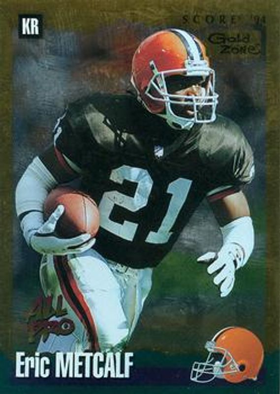 The Eric Metcalf 1994 Score #6 Gold Zone card is 1 of 3 Eric Metcalf's card variations in the 1994 Score set being tracked by Sports Card Investor, including Base, and Dream Team.