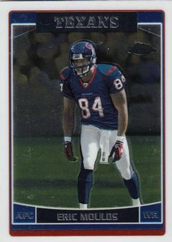 The Eric Moulds 2006 Topps Chrome #163 Base card is 1 of 10 Eric Moulds' card variations in the 2006 Topps Chrome set being tracked by Sports Card Investor, including Printing Plates Black /1, Printing Plates Cyan /1, Printing Plates Magenta /1, Printing Plates Yellow /1, and Superfractor /1.
