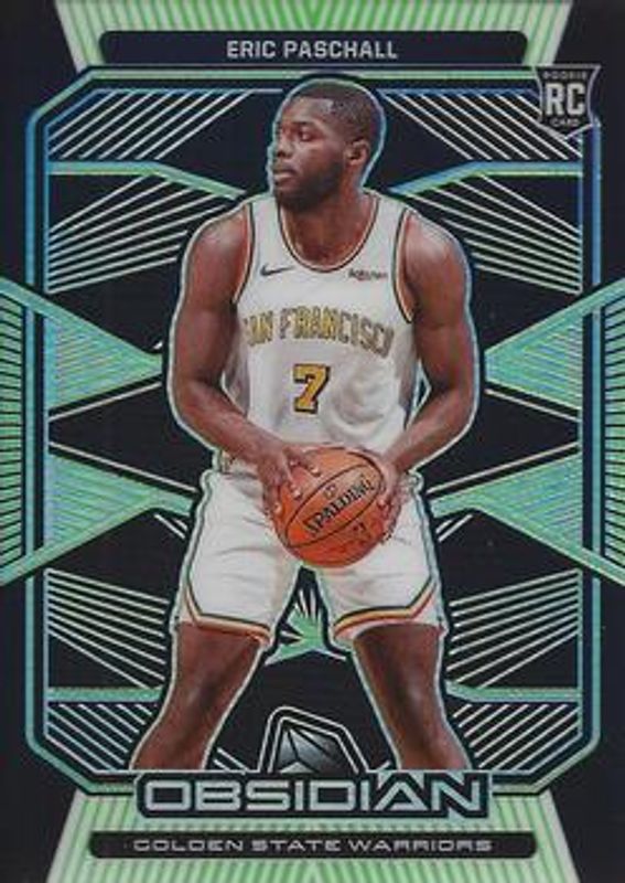 The Eric Paschall 2019 Obsidian #188 Electric Etch Green /25 Rookie card is 1 of 26 Eric Paschall's card variations in the 2019 Obsidian set being tracked by Sports Card Investor, including #188 Base, #201 Base, #188 Electric Etch Purple /75, #201 Electric Etch Purple /75, and #188 Electric Etch Orange /50.