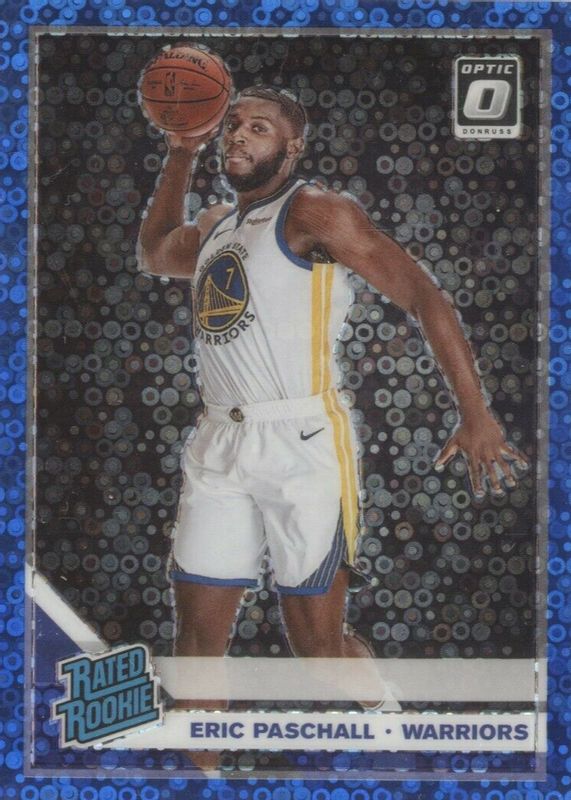 The Eric Paschall 2019 Optic #199 Fast Break Blue /50 Rookie card in Raw condition has not changed in price in the last 30 days and was last sold for $0.99 .