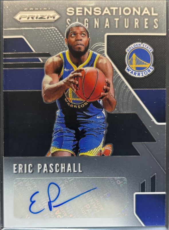 The Eric Paschall 2019 Prizm #SS-EPS Sensational Signatures Rookie card is 1 of 72 Eric Paschall's card variations in the 2019 Prizm set being tracked by Sports Card Investor, including Base, Choice Blue Yellow Green, Fanatics Green Ice, Fast Break, and FOTL Blue Shimmer.