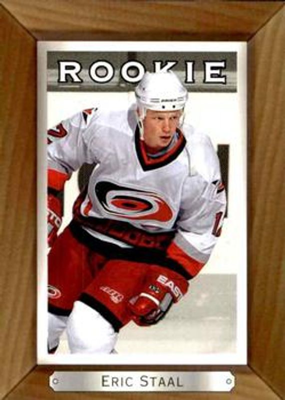 The Eric Staal 2003 Upper Deck Beehive #204 Base Rookie card is 1 of 4 Eric Staal's card variations in the 2003 Upper Deck Beehive set being tracked by Sports Card Investor, including Silver /67, Golden /15, and Jumbo Variations.
