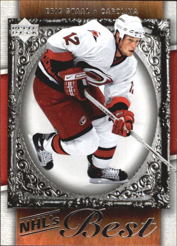 The Eric Staal 2007 Upper Deck #B14 NHL's Best card is 1 of 25 Eric Staal's card variations in the 2007 Upper Deck set being tracked by Sports Card Investor, including #181 Base, #432 Base, #181 UD Exclusives /100, #432 UD Exclusives /100, and #181 UD High Gloss /10.
