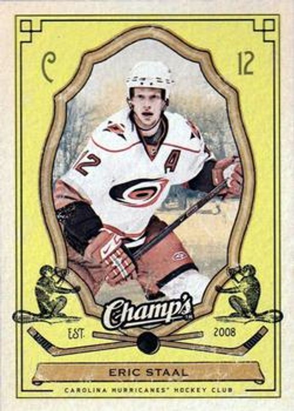 The Eric Staal 2009 Upper Deck Champ's #19 Animal Icons card is 1 of 10 Eric Staal's card variations in the 2009 Upper Deck Champ's set being tracked by Sports Card Investor, including #19 Base, #215 Base, #19 Green, #19 Red, and #19 Yellow.