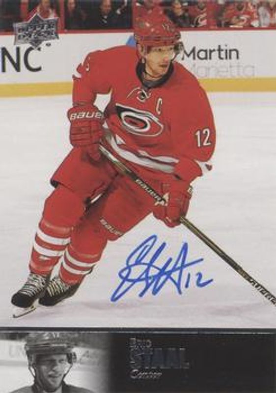 The Eric Staal 2020 Upper Deck Ultimate Collection #AL-174 1997 Ultimate Legends Signatures card is 1 of 16 Eric Staal's card variations in the 2020 Upper Deck Ultimate Collection set being tracked by Sports Card Investor, including Base /299, Autographs, Gold /35, Autographs Gold /15, and Onyx Black /5.