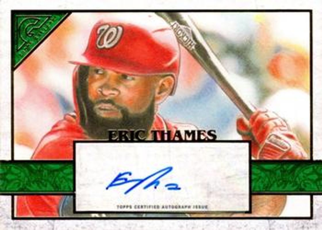 The Eric Thames 2020 Topps Gallery #90 Autographs - Green /99 card is 1 of 18 Eric Thames' card variations in the 2020 Topps Gallery set being tracked by Sports Card Investor, including Base, Artist's Proofs, Rainbow Foil, Wood, and Private Issue /250.