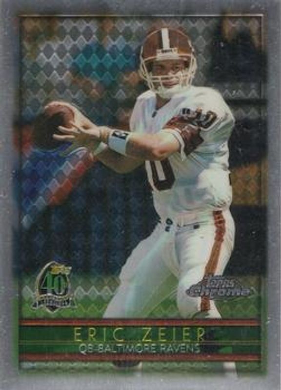 The Eric Zeier 1996 Topps Chrome #144 Base card is 1 of 2 Eric Zeier's card variations in the 1996 Topps Chrome set being tracked by Sports Card Investor, including Refractor.