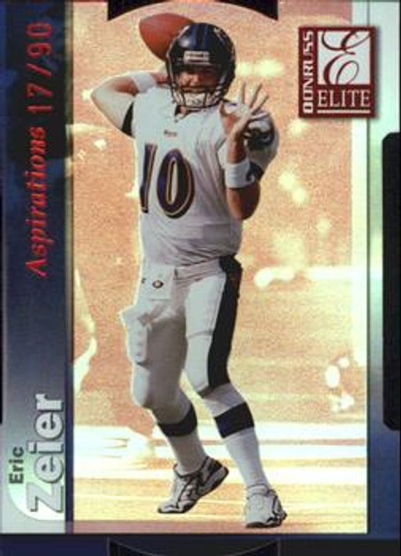 The Eric Zeier 1999 Donruss Elite #050 Aspirations /72 card is 1 of 3 Eric Zeier's card variations in the 1999 Donruss Elite set being tracked by Sports Card Investor, including Base, and Status /28.