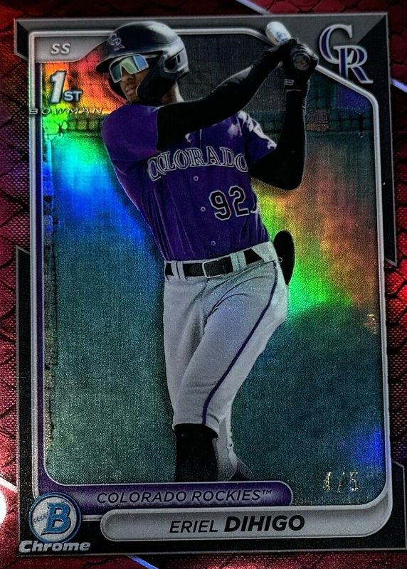 This card is 1 of 51 Eriel Dihigo's card variations in the 2024 Bowman Chrome set being tracked by Sports Card Investor, including Prospects (1st), Prospects - Shimmer Refractor (1st), Prospects - Refractor /499 (1st), Prospects - Speckle Refractor /299 (1st), and Prospects - Purple Refractor /250 (1st).
