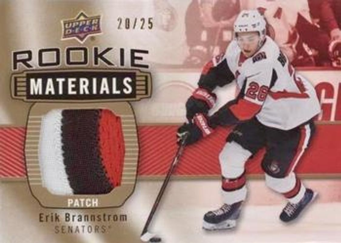 The Erik Brannstrom 2019 Upper Deck #RM-EB Rookie Materials Patch /25 card is 1 of 31 Erik Brannstrom's card variations in the 2019 Upper Deck set being tracked by Sports Card Investor, including Young Guns Base, Young Guns Canvas, Young Guns - Clear Cut, Young Guns - Clear Cut Exclusives, and Young Guns - Silver Foil.