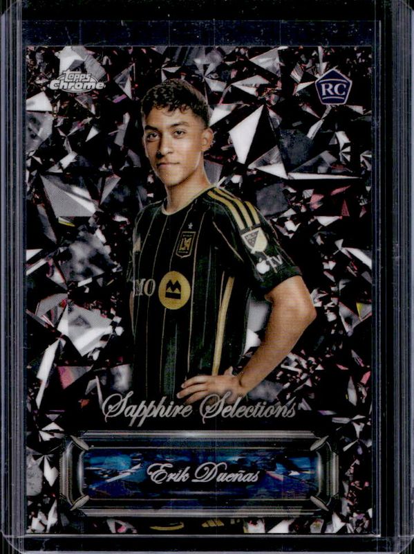 The Erik Duenas 2024 Topps Chrome MLS Sapphire Edition #SS-3 Sapphire Selections - Black /10 card is 1 of 21 Erik Duenas' card variations in the 2024 Topps Chrome MLS Sapphire Edition set being tracked by Sports Card Investor, including #51 Chrome, #74 Chrome, #SA-ED Sapphire Autographs, #SS-3 Sapphire Selections, and #74 Chrome - Gold /50.
