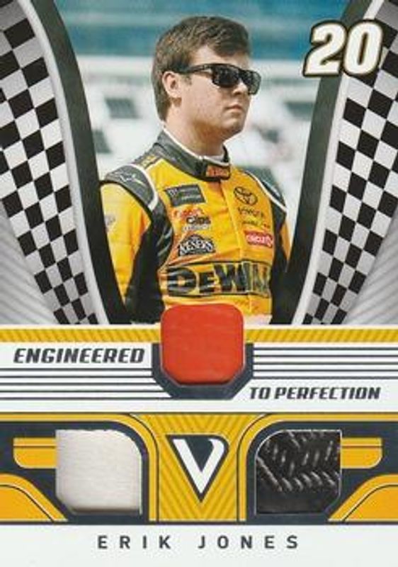 The Erik Jones 2018 Victory Lane NASCAR #EPT-EJ Engineered to Perfection Triple Materials /399 card is 1 of 48 Erik Jones' card variations in the 2018 Victory Lane NASCAR set being tracked by Sports Card Investor, including Base, Silver, Gold /99, Red /49, and Blue /25.