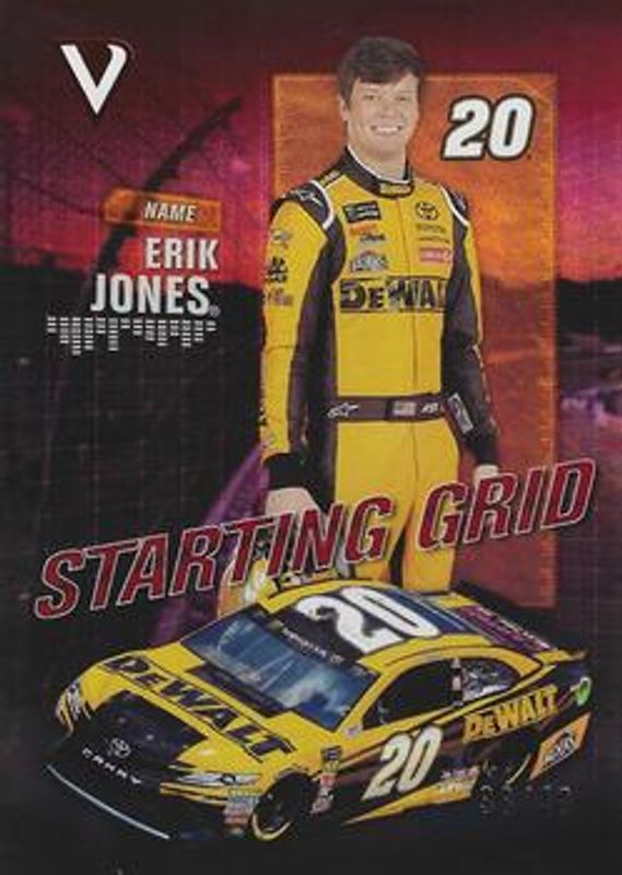 The Erik Jones 2018 Victory Lane NASCAR #S14 Starting Grid Red /49 card is 1 of 48 Erik Jones' card variations in the 2018 Victory Lane NASCAR set being tracked by Sports Card Investor, including Base, Silver, Gold /99, Red /49, and Blue /25.