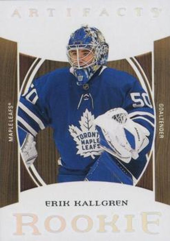 The Erik Kallgren 2022 Upper Deck Artifacts #191 Wood Rookie card is 1 of 19 Erik Kallgren's card variations in the 2022 Upper Deck Artifacts set being tracked by Sports Card Investor, including Base /999, Leather, Plexi, Turquoise, and Ruby /499.
