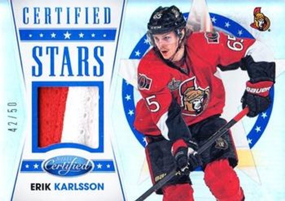 The Erik Karlsson 2012 Certified #S16 Stars Materials Mirror Blue Prime /50 card is 1 of 20 Erik Karlsson's card variations in the 2012 Certified set being tracked by Sports Card Investor, including Base /999, Mirror Red /100, Mirror Hot Box /75, Mirror Blue /50, and Mirror Gold /25.